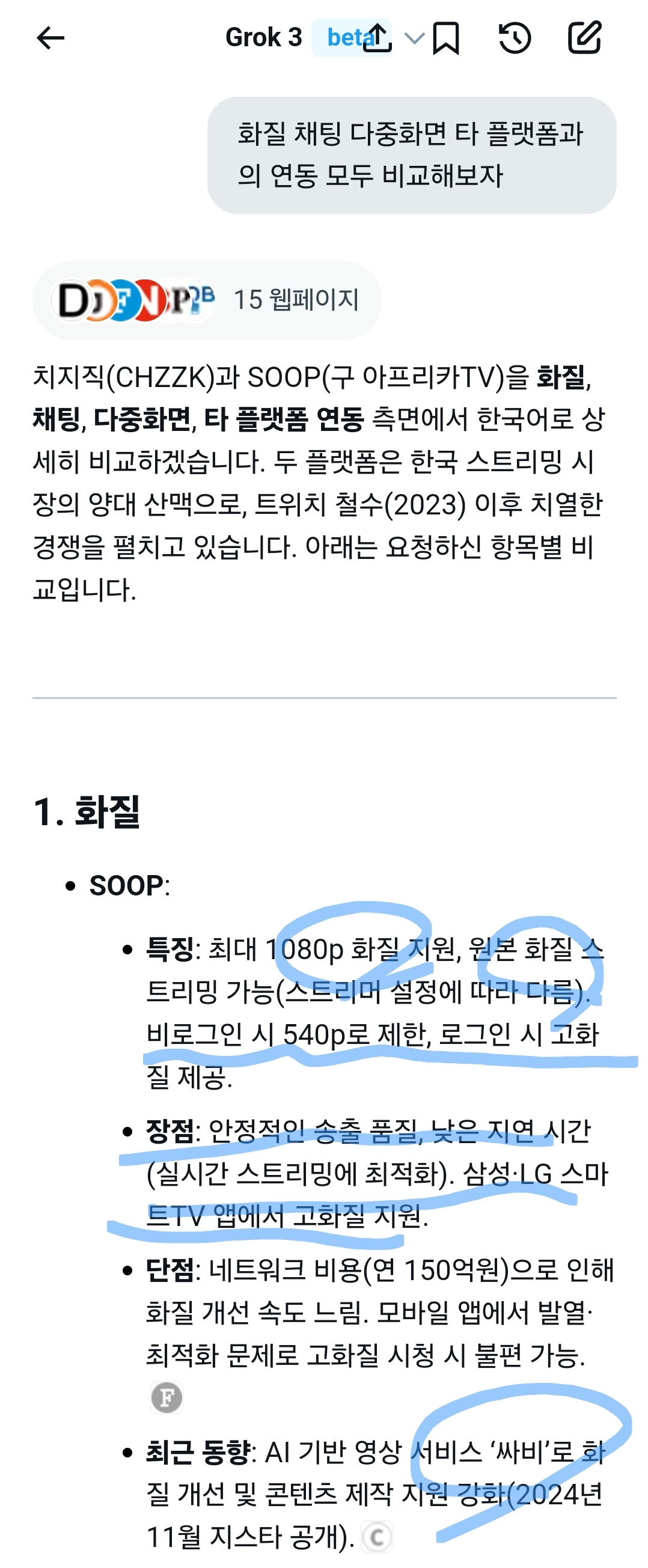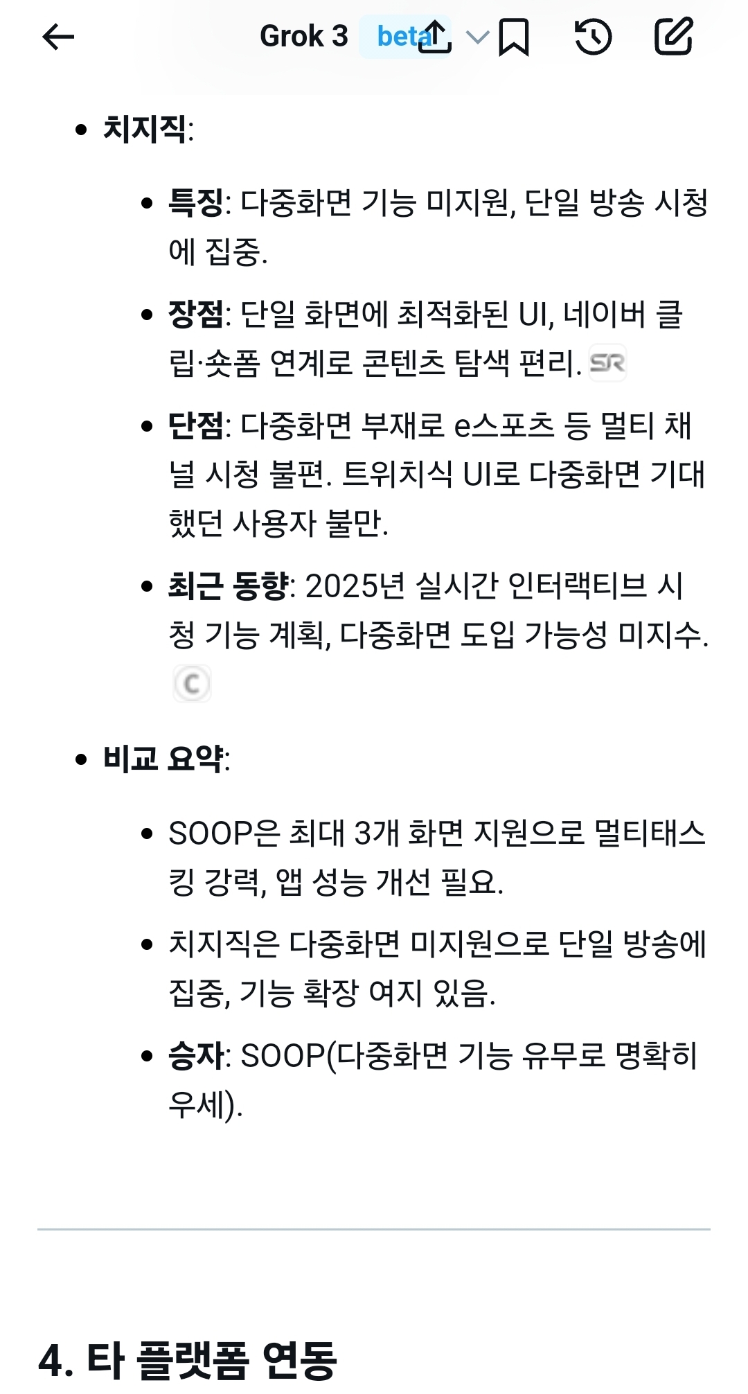다만, SOOP의 다중화면과 채팅은 현재 사용자 경험에서 강력하며, e스포츠·스마트TV 사용자라면 SOOP이 더 적합할 수 있습니다. 특정 선호(예: e스포츠 중점, 모바일 시청) 있으시면 추가 비교 가능합니다!