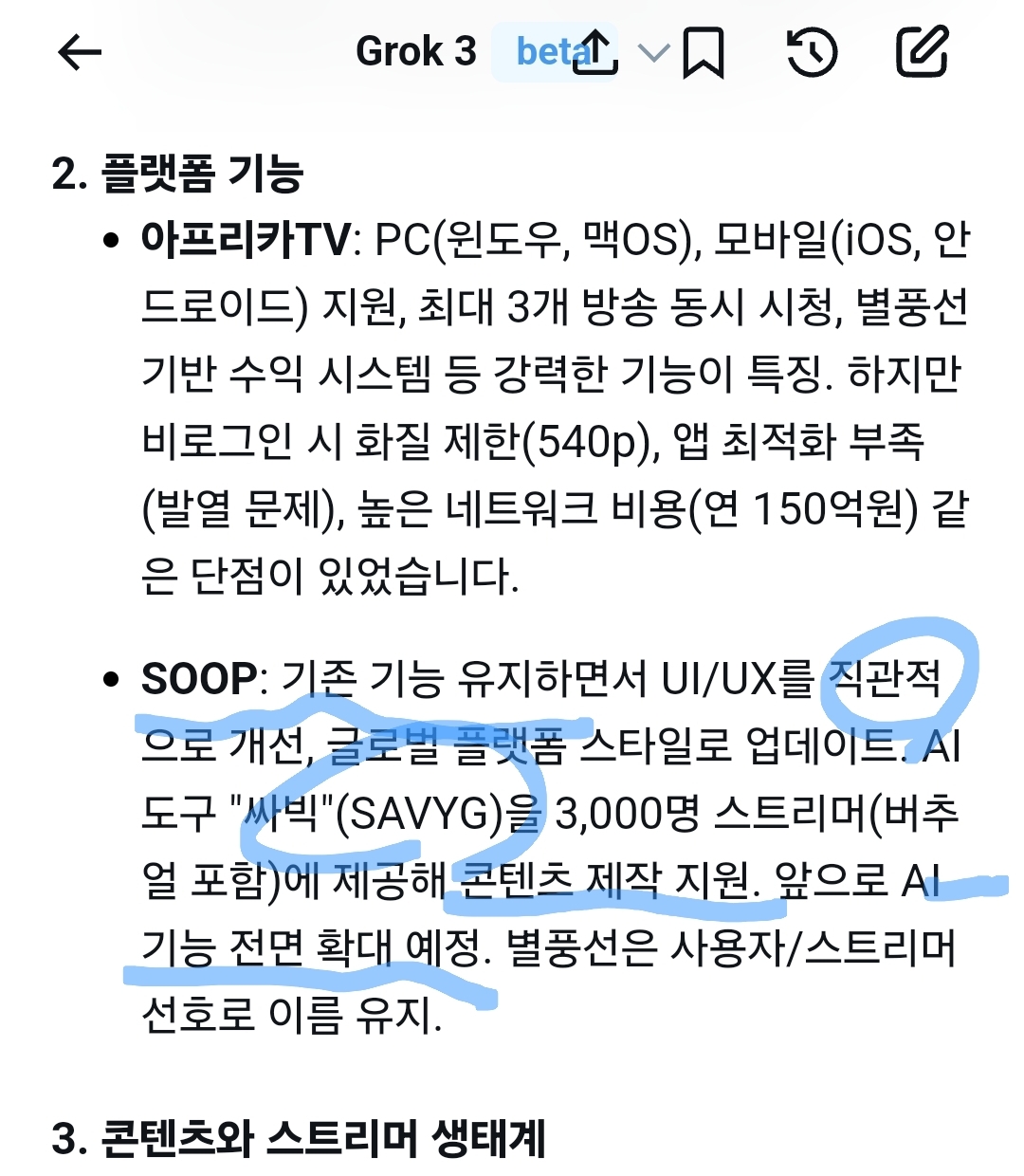 SOOP: 기존 기능 유지하면서 UI/UX를 직관적으로 개선, 글로벌 플랫폼 스타일로 업데이트. AI 도구 "싸빅"(SAVYG)을 3,000명 스트리머(버추얼 포함)에 제공해 콘텐츠 제작 지원. 앞으로 AI 기능 전면 확대 예정. 별풍선은 사용자/스트리머 선호로 이름 유지.