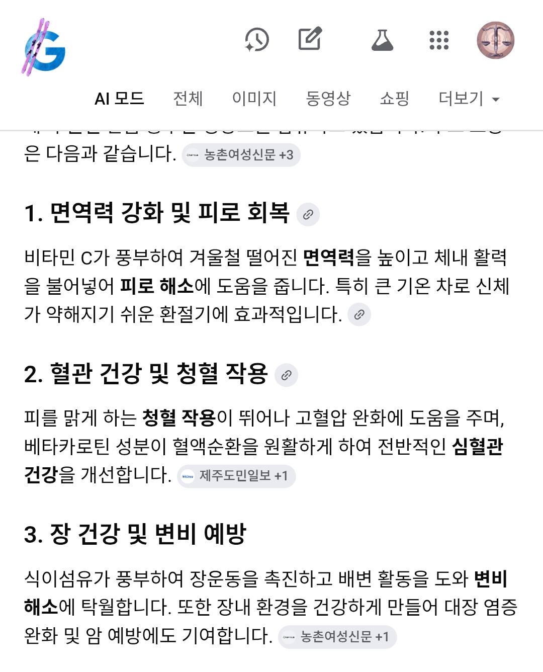 혈관 건강 및 혈액 순환: 베타카로틴과 비타민 성분이 혈액 속 노폐물과 콜레스테롤을 줄여 혈액순환을 돕고 고혈압 등 혈관 질환을 예방합니다.